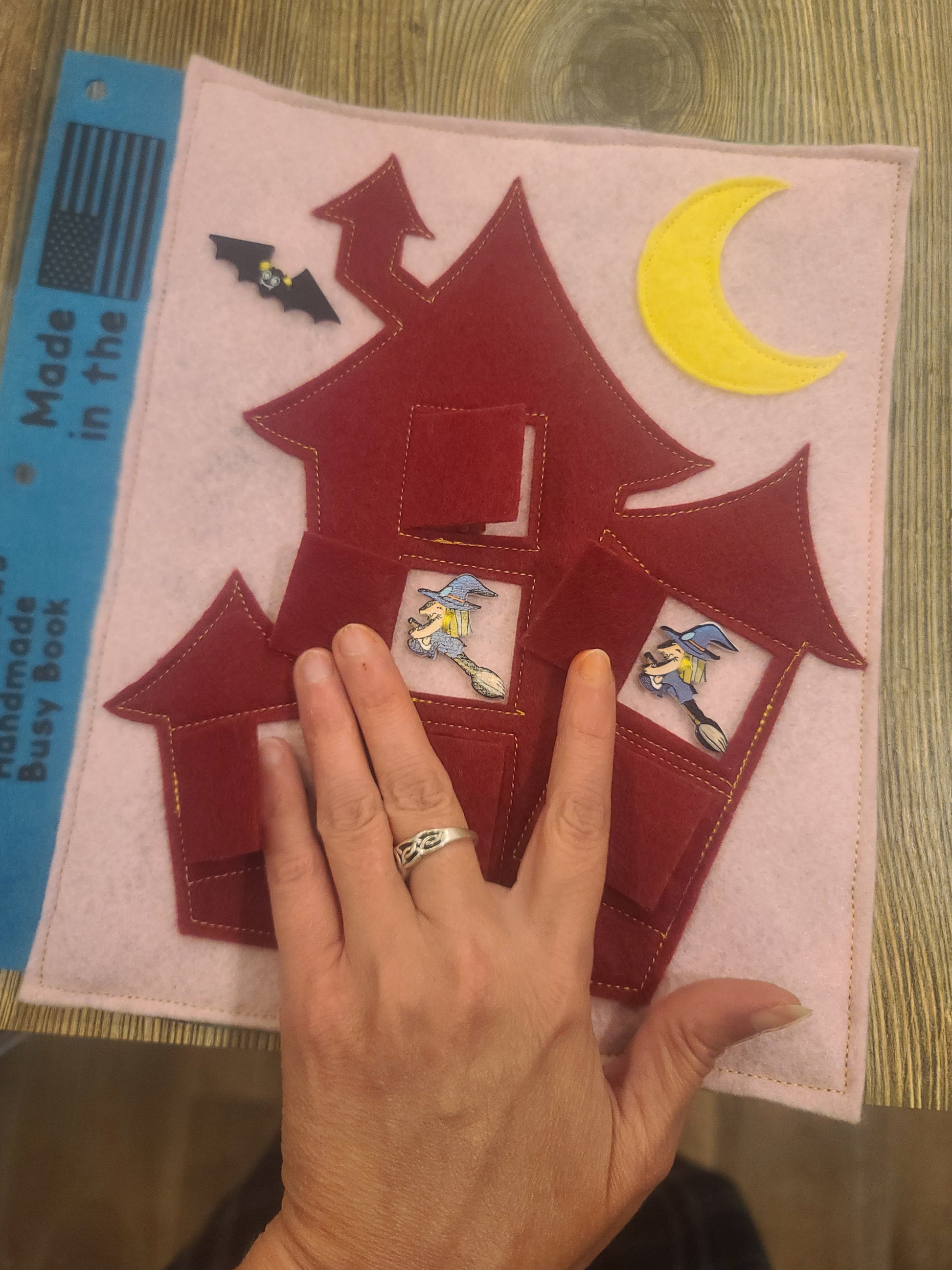 The Haunted House Peek-a-Boo Busy Book Page invites little learners to explore a spooky (but silly!) felt mansion full of surprises. Children can open each window to discover friendly Halloween characters like pumpkins, cats, and bats—all while strengthening fine motor coordination, finding matching figures, and engaging in imaginative play.